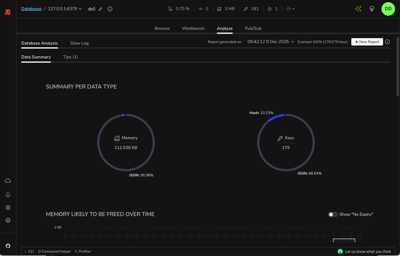 Use the database analysis tool to optimize the performance and memory usage of your Redis database. Check data type distribution and memory allocation and review the summary of key expiration time and memory to be freed over time. Inspect the top keys and namespaces sorted by consumed memory or key length and count of keys, respectively. Capture and track the changes in your database by viewing historical analysis reports. Next figure shows a sample database analysis report.