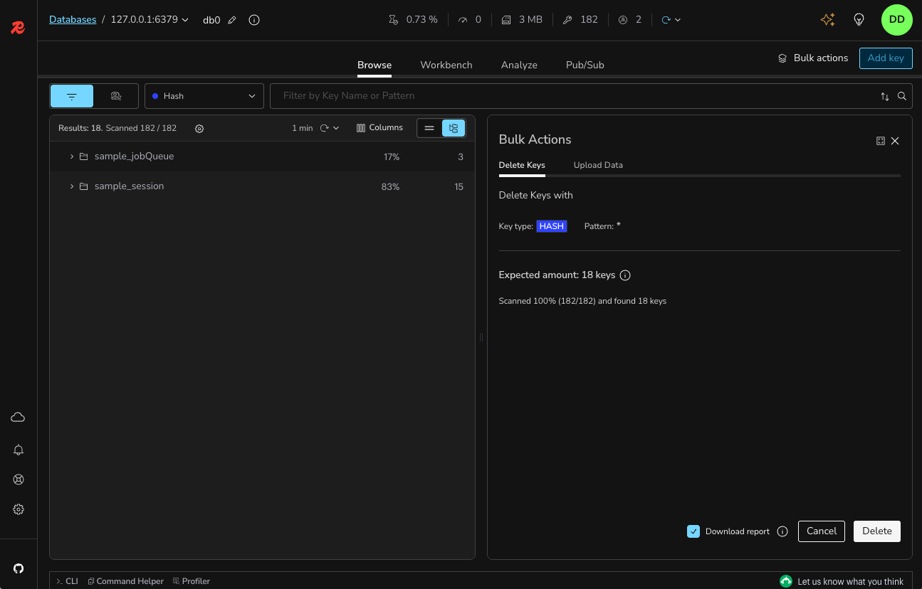 When the bulk deletion is completed, Redis Insight displays the results of this operation with the number of keys processed and the time taken to delete the keys in bulk. Use bulk deletion to optimize the usage of your database based on the results from the Redis database analysis.