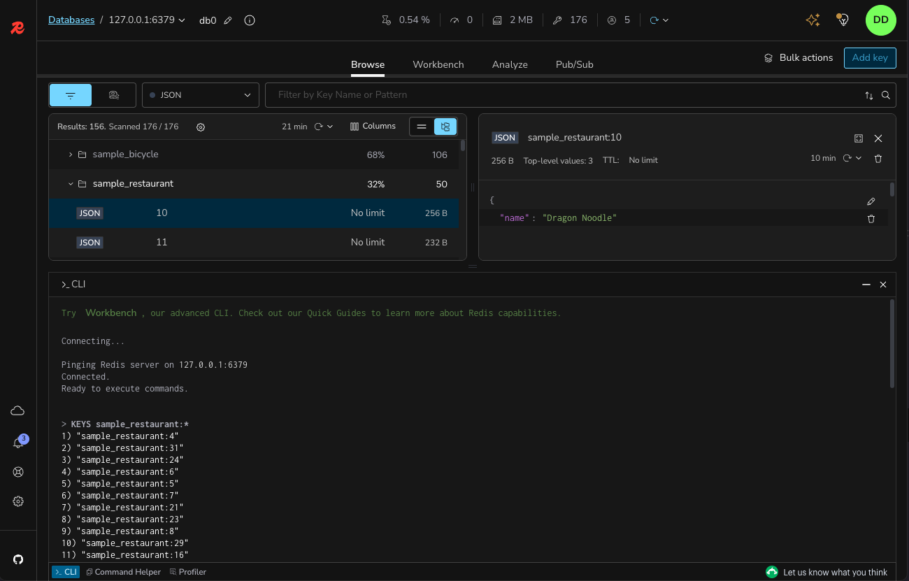 The CLI is accessible at any time within the application. To use the CLI, click >_ CLI at the bottom left of the screen. It should reveal the CLI window, and there you can start typing Redis commands.