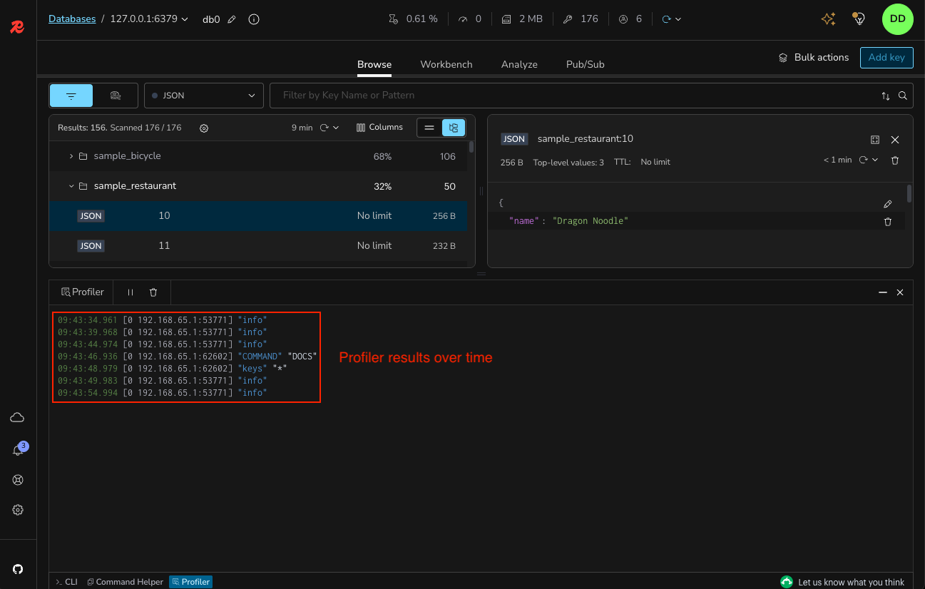 Analyze every command sent to Redis in real time. To use the profiler, click Profiler at the bottom left of the screen. It should reveal the profiler window, and there you can start the profiler by clicking on Start Profiler.