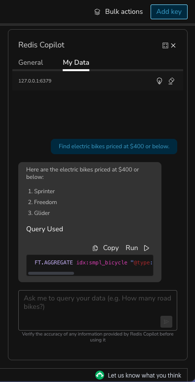 My data chatbot: the context-aware chatbot available in Redis Insight lets you construct search queries using everyday language rather than requiring specific programming syntax. This feature lets you query and explore data easily and interactively without extensive technical knowledge.