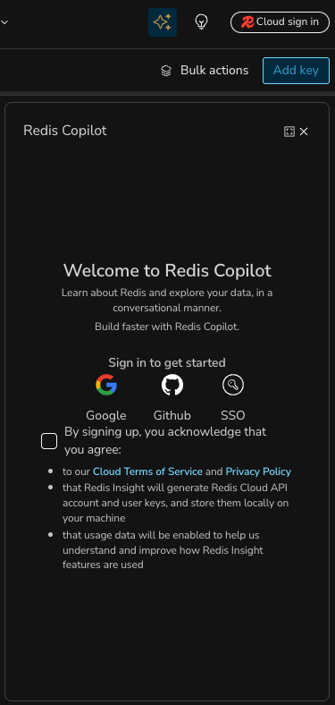 Before you can use Redis Copilot, you must first sign in and accept the terms of use. Click on the Redis Copilot icon in the top right corner of the Redis Insight window to sign in and accept the terms of use.