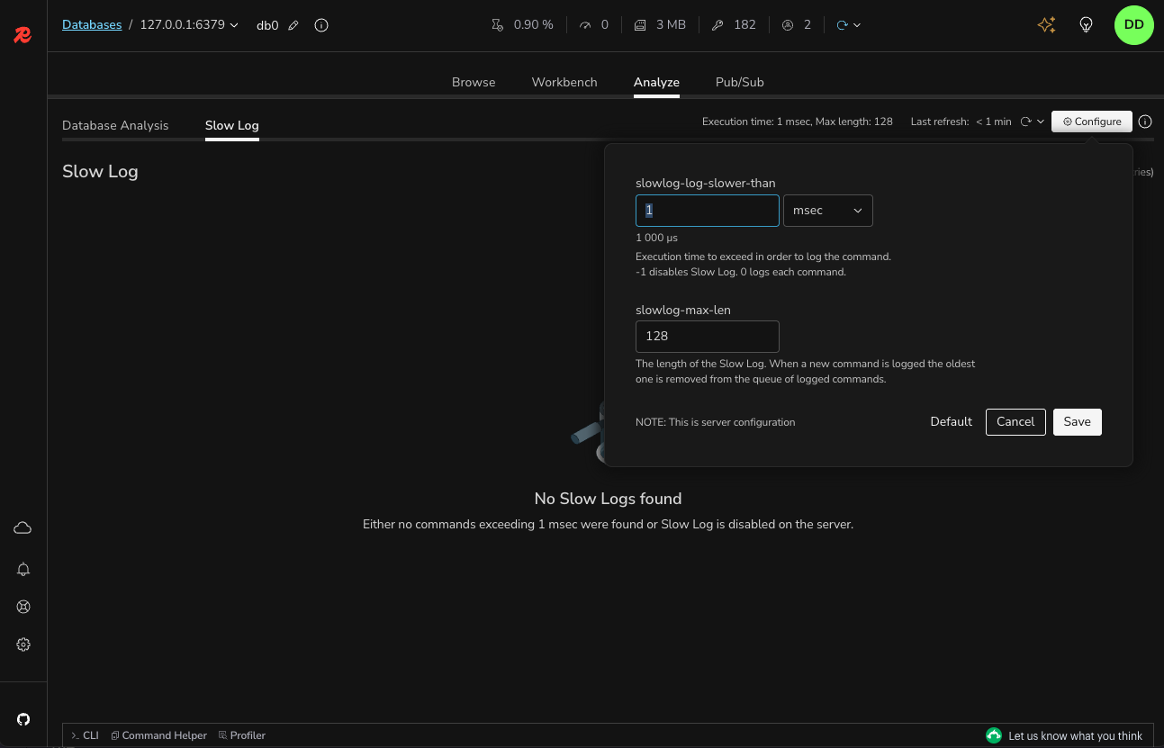 The Slow Log tool displays the list of logs captured by the SLOWLOG command to analyze all commands that exceed a specified runtime, which helps with troubleshooting performance issues. Specify both the runtime and the maximum length of Slowlog (which are server configurations) to configure the list of commands logged and set the auto-refresh interval to automatically update the list of commands displayed.