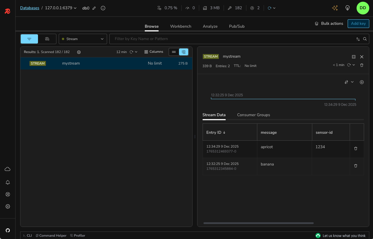 View and manage the list of consumer groups. See existing consumers in a given consumer name as well as the last messages delivered to them. Inspect the list of pending messages, explicitly acknowledge the processed items, or claim unprocessed messages via Redis Insight.